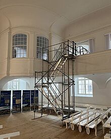 Pünktlich zum Jahresbeginn haben im Herrnhuter Kirchensaal die Bauarbeiten im Seitenflügel auf der Schwesternseite begonnen. Um den Zugang zur Schwesternempore zu gewährleisten, während das Treppenhaus abgesperrt ist, wurde im Saal ein Treppenturm errichtet. Finanziert wird dieser letzte große Bauabschnitt der Saalsanierung durch verschiedene Förderungen aus öffentlicher Hand. Erst kurz vor Weihnachten kam noch der letzte Zuwendungsbescheid, in diesem Fall für Fördermittel in Höhe von rund 370.000 Euro, die zur Ertüchtigung von Räumen auf der Schwesternseite als „Welterbe-Informationspunkt“ dienen. „Wir sind sehr dankbar für diese Hilfe, die uns unter anderem beim Einbau sanitärer Anlagen und eines Aufzugs unterstützen und auch eine moderne Ausstattung der Unitäts-Ausstellung ermöglichen,“ erklärt Bruder Peter Vogt, Gemeinhelfer in Herrnhut. Für das seit fünf Jahren laufende Bauprojekt wurden insgesamt rund 3,8 Mio Euro an Fördermitteln eingeworben. „Ein maßgeblicher Anteil davon kommt über verschiedene Programme vom Bund und vom Freistaat Sachsen. Aber auch die Brüder-Unität, die Herrnhuter Diakonie, weitere Stiftungen und viele Einzelspender tragen zum Gelingen des Projektes bei, und natürlich hat unser Förderverein dabei eine wesentliche Rolle gespielt,“ sagt Vorsteherin Andrea Kretschmar. Für die erforderlichen Eigenmittel müssen weiterhin Spenden eingeworben werden. Insgesamt fehlen aktuell noch etwa 90.000 Euro. Bis Ende des Jahres sollen die Bauarbeiten abgeschlossen sein, so dass die Unitätsausstellung bald wieder ihren Betrieb aufnehmen kann. |