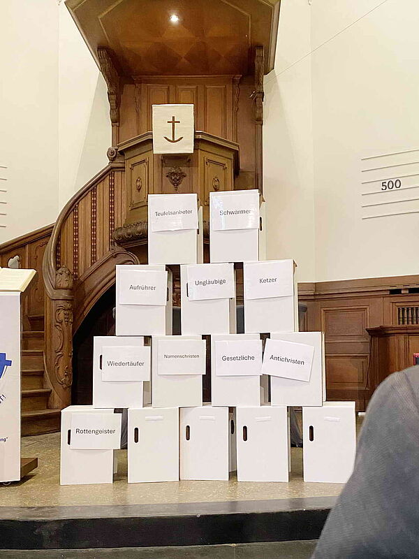 Und eindrücklich waren die Mauersteine, die zuerst mit Hassworten markiert waren und dann zu Wegsteinen wurden – mit heilenden Worten – ausgesprochen von Vertreterinnen und Vertretern der Ökumene: nicht Wiedertäufer – sondern Täufer, nicht Ketzer – sondern Geschwister, Begnadete, Friedenstifter, gemeinsame Glaubenszeugen, Gotteskinder.