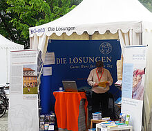 Die Losungen hatten, inmitten anderer ökumenischer Stände, auf dem 100. Katholikentag in Leipzig einen guten Platz: Direkt an der Propsteikirche St. Trinitatis kam fast jeder Besucher des Katholikentages einmal vorbei, wollte man doch den neuen katholischen Kirchenbau im Zentrum Leipzigs einmal sehen. Noch vor Öffnung der Kirchenmeile fragten bereits erste Besucher nach den Losungen. Großes Interesse fanden die verschiedenen ausländischen Losungsausgaben. Ein katholischer Christ aus Kamerun griff gleich zu den französischen »Paroles et Textes« und war ganz erstaunt, als ihm Standleiter Pfr. Fr. Hasting eine Losung auf Basaa zeigt, einer der vielen Sprachen in seinem Heimatland. – Über 300 mal ließen sich Besucher auch Losungen von einem besonderen Tag in ihrem Leben ausdrucken. Der Stand wurde von Mitgliedern der Brüdergemeine in Gnadau und Leipzig betreut. |