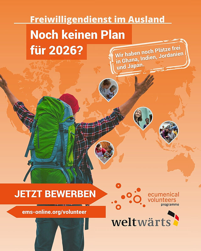 Gute Nachricht für alle, die es ins Ausland zieht und die noch nicht wissen, was sie ab dem Sommer machen sollen. Vom EMS (Evangelische Mission in Solidarität) erreichte uns folgender Aufruf: