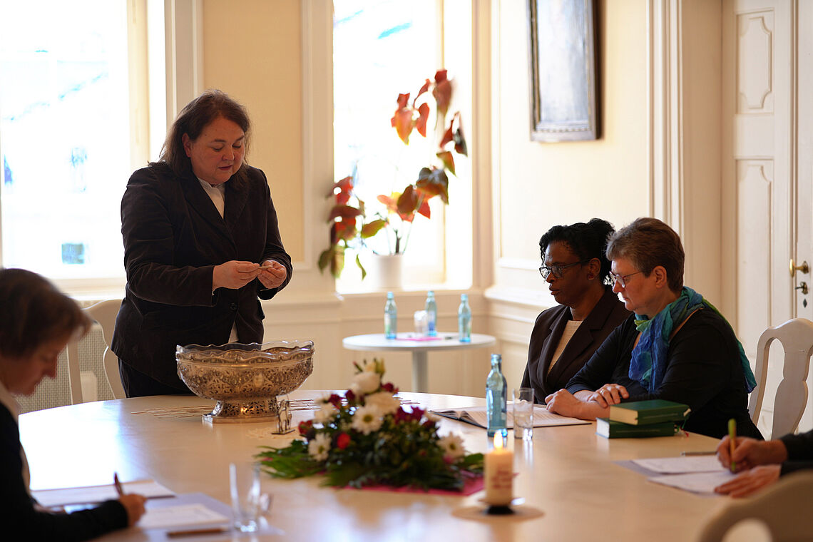 Traditionell verständigen sich am Nachmittag nach dem Losungsziehen Mitarbeitende des Friedrich-Reinhardt-Verlags und der Evangelischen Brüder-Unität. Der Verlag Friedrich Reinhardt sorgt für Druck und Vertrieb der verschiedenen Ausgaben. Bei dem Gespräch geht es unter anderem um Fragen der Digitalisierung, aber auch um die Reaktionen von Losungslesern.