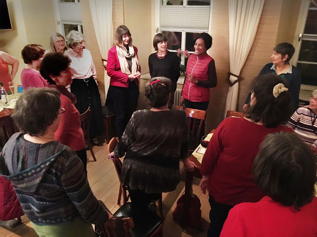 Neben dem diesjährigen Thema »Ich will dich segnen und du sollst ein Segen sein« hatte die Schwesternwerkstatt vom 26. bis 28. Januar in Neudietendorf noch einen zweiten Schwerpunkt: Surinam. Auch gut vorinformierte Schwestern lernten noch einiges Neue durch Schw. A. Clemens’ Vortrag über das Leben von Frauen im diesjährigen Weltgebetstags-Land. Stargast aber war die Komponistin des Motto-Liedes für den Weltgebetstag, Schw. Mavis Noordwijk. Auf dem Foto singt sie gemeinsam mit Schw. Clemens und Schw. A. Vollprecht die surinamische Nationalhymne.