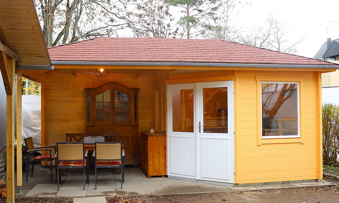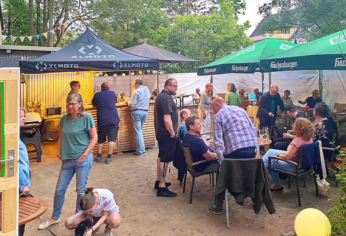 Doch dabei ist es nicht geblieben. Nach einem Sommer mit vielen schönen gemeinsamen Abenden entstand die Idee, das Areal weiter auszubauen – und so blieb das blaue Häuschen nicht lange allein. Eine rote Hütte gesellte sich dazu. Diese dient nun als Lager, wird aber bei Veranstaltungen schnell zu einem Atelier oder einer Stöberstube. Zudem hat sie einen überdachten Außenbereich, der nicht nur für Veranstaltungen, sondern auch von der Nachbarschaft oder von den Erzieherinnen des Kinderhauses gerne für ein Beisammensein und die eine oder andere Pause genutzt wird. Auch vor und nach Versammlungen oder Sitzungen sind hier oft Gemeindemitglieder anzutreffen, die in netter Runde beisammensitzen.